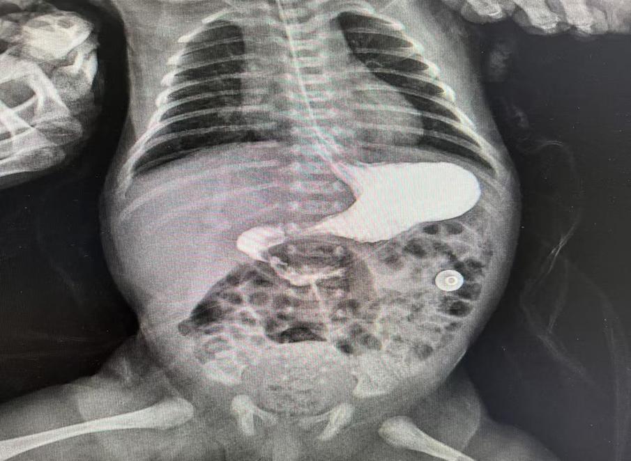 次日,在新生兒科、麻醉科及手術室的密切配合下,患兒在全麻下由上海兒童醫(yī)學中心(國家兒童醫(yī)學中心)小兒外科陳杰教授指導,衡陽市中心醫(yī)院小兒外科唐水平主任進行剖腹探查,術中發(fā)現(xiàn)環(huán)狀胰腺引起的十二指腸閉鎖梗阻,行十二指腸菱型吻合術+空腸營養(yǎng)管留置,手術歷時兩小時后順利完成,手術結束后即脫機拔管。