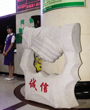 近日,一尊命名為《誠(chéng)信》的主題石雕在衡陽(yáng)市中心醫(yī)院門診大廳肅然矗立,兩只大手緊緊相握的寫(xiě)意場(chǎng)景映襯著近旁整墻的患者送來(lái)的感謝信和錦旗,過(guò)往患者和醫(yī)務(wù)人員紛紛駐足“圍觀”。