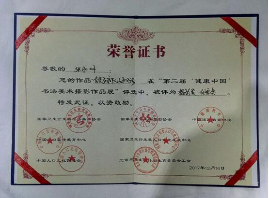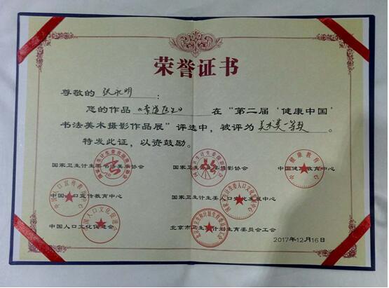 為大力推進“健康中國”建設,全方位倡導大健康理念,慶祝黨的十九大勝利召開,由國家衛(wèi)生計生委書法美術協會、國家衛(wèi)生計生委攝影協會、中國健康教育中心、中國人口宣傳教育中心、人口文化發(fā)展中心、中國人口文化發(fā)展促進會,中國家庭報社承辦的“第二屆‘健康中國’書法美術攝影作品展”于2017年12月16日—17日在北京國際會議中心隆重舉辦。我院門診辦支部書記張永明的美術作品國畫《索道醫(yī)生》榮獲一等獎、攝影作品《黨員醫(yī)療隊深入山區(qū)義診》榮獲優(yōu)秀獎,這是張永明繼去年在省衛(wèi)計委工會舉辦的書法、美術、攝影獲雙獎后又一次飛躍。