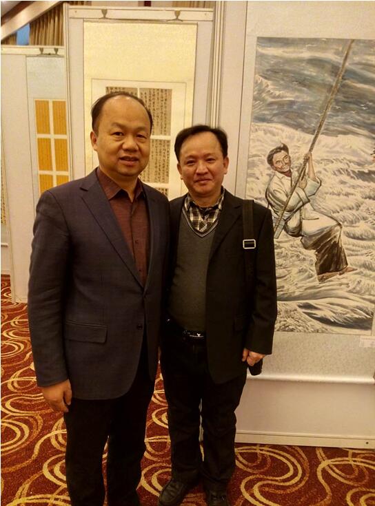 國家衛(wèi)生計生委副主任、委書法美術協會主席金小桃在國畫《索道醫(yī)生》畫前與作者張永明合影。