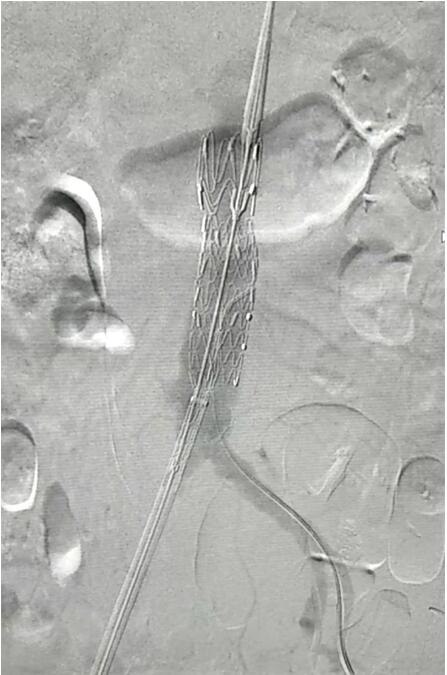 血管介入科行腹主動脈瘤覆膜支架隔絕術(shù)(“褲衩”支架植入)。圖3