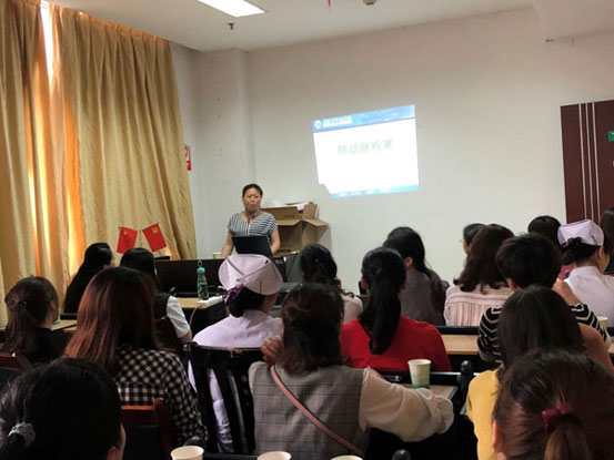 護(hù)理部主任周艷玉首先發(fā)表致辭,她指出,VTE是一種常見的血管疾病,其發(fā)生率高、致殘率高、死亡率高,在臨床上稱為“沉默的殺手”,但其又是可以及時預(yù)防的,此次的培訓(xùn)主題就是圍繞防治VTE展開的,希望大家學(xué)有所獲,學(xué)之致用,并將學(xué)到的知識用到工作中。隨后,骨科一區(qū)譚燕老師結(jié)合自己多年的臨床護(hù)理經(jīng)驗(yàn),以PPT課件的方式,詳細(xì)為大家闡述了肺動脈栓塞護(hù)理的注意事項(xiàng)與預(yù)防措施,并分享了臨床典型案例。最后,骨科一區(qū)楊航、陳紫嫣兩位護(hù)士采用理論結(jié)合實(shí)際的方式,播放了自己編排的靜脈血栓預(yù)防保健操視頻,并現(xiàn)場教進(jìn)行教學(xué),讓大家盡快掌握了保健操的要點(diǎn)。