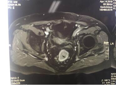 入院后譚曙光主任帶領(lǐng)賀賽奇副主任、周高副主任醫(yī)師及周平主治醫(yī)師等科室業(yè)務(wù)骨干為汪老制定詳細(xì)診療計(jì)劃。術(shù)前盆腔MRI及腸鏡、病理診斷考慮低位直腸腺癌(T3aN0M0)。鑒于汪老年老體弱,病變位置低,基礎(chǔ)疾病多,耐受力較差,譚主任及其手術(shù)團(tuán)隊(duì)精益求精,不斷完善診療措施,術(shù)前采取MDT(多學(xué)科合作)模式,于4月18日在全麻腹腔鏡下行直腸癌根治術(shù)+D3淋巴結(jié)清掃術(shù)+粘連松解,手術(shù)順利,術(shù)中徹底松解腹腔內(nèi)粘連,標(biāo)準(zhǔn)的TME(直腸全系膜切除)及D3淋巴結(jié)清掃,腹腔鏡下吻合口加固縫合,手術(shù)出血僅30ml,在原有的手術(shù)切口處取出手術(shù)標(biāo)本。