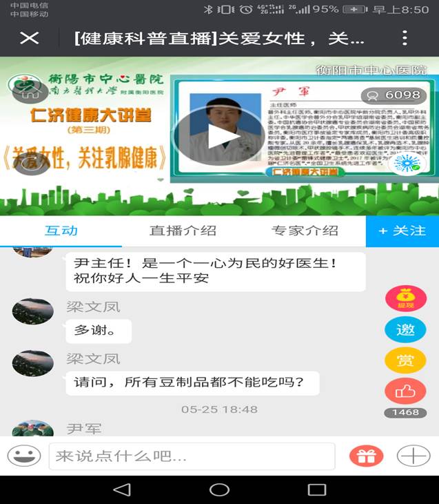仁濟(jì)健康大講堂在華新院區(qū)開(kāi)講了 發(fā)布時(shí)間:2018年5月29日 預(yù)覽:2395次 通訊員楊柳報(bào)道:5月25日,市中心醫(yī)院仁濟(jì)健康大講堂第3期在華新院區(qū)開(kāi)講。本期大講堂特邀乳甲外科尹軍主任以《關(guān)愛(ài)女性健康遠(yuǎn)離乳腺疾病》為題,為患者及家屬講解乳腺癌的預(yù)防和治療。該講堂用圖文并茂的形式,深入淺出地為大家普及醫(yī)療知識(shí),風(fēng)趣的授課方式吸引了100余名市民朋友和患者到場(chǎng)聽(tīng)課,現(xiàn)場(chǎng)還通過(guò)微信進(jìn)行了網(wǎng)絡(luò)直播。 課堂開(kāi)始從流行病學(xué)角度以通俗易懂的語(yǔ)言和圖片向聽(tīng)眾介紹了乳腺癌在我國(guó)的發(fā)病情況,逐層深入地介紹如何從病因進(jìn)行預(yù)防。隨后,現(xiàn)場(chǎng)指導(dǎo)大家如何自己在家中進(jìn)行簡(jiǎn)單的體查,并告訴大家隨著醫(yī)學(xué)科學(xué)的發(fā)展和治療手段的改進(jìn),惡性腫瘤的治愈率不斷提高,希望通過(guò)本次講堂讓更多患者和家屬更加清晰地認(rèn)識(shí)到乳腺癌的發(fā)生與發(fā)展,幫助患者掃除疑慮,積極治療,為大家普及健康知識(shí)。課后大家在課堂上就自身遇到的問(wèn)題積極提問(wèn),尹主任一一作了詳細(xì)的回答。 《仁濟(jì)健康大講堂》是市中心醫(yī)院內(nèi)部各科室專家聯(lián)動(dòng)舉辦的系列課程,科普講座以服務(wù)患者,提高健康知識(shí)知曉率,提高全民健康素養(yǎng),讓更多百姓受益。是醫(yī)院公益性的一項(xiàng)工作。醫(yī)院努力創(chuàng)造出一種人文化就醫(yī)環(huán)境,一切以患者為中心,在疾病治療進(jìn)程中,醫(yī)患關(guān)系更加融洽,高效、優(yōu)質(zhì)地為病友提供診療服務(wù)。 仁濟(jì)直播間在線互動(dòng)答疑 仁濟(jì)大講堂現(xiàn)場(chǎng)