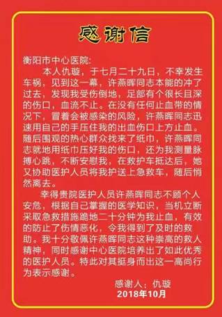 做好事后沒留名,聞訊錦旗送上門 發(fā)布時間:2018年10月26日 11:47:30 預(yù)覽:2179次 通訊員張永明報道:10月25日,門診辦公室意外收到一面錦旗和感謝信。事后了解得知是三個月前發(fā)生的一件隱姓埋名做好事感人的事情。 7月29日星期天上午,袁俊杰、仇璇兩夫妻帶著小孩騎摩托車從香格里拉小區(qū)出來,途中不幸被急馳的小車掛傷,造成左足跟部撕裂傷約16cm,流血不止。被巧遇從此路過的護(hù)士許燕暉看到和聽到呻吟聲,她迅速走近傷者面前,并及時讓旁邊人呼叫120,當(dāng)天上午近11點鐘,烈日當(dāng)空的地上滾燙,她依然穿著短裙赤腳跪在熱地板上20多分鐘不顧被傷者流血感染徒手壓著傷口上方止血,同時又測量傷者脈搏心跳,觀察面色有無異常,還不斷地安慰傷者,等120救扶車趕到才悄然離開。后經(jīng)傷者方多方打聽才得到基本線索,許燕暉認(rèn)為自己只是做了一件很平常的事,所以一直隱姓埋名三個月里從沒有言說。之后,傷者仇璇的愛人袁俊杰送病人到衡陽市中心醫(yī)院看病,在門診大廳無意間碰到了許燕暉,感覺面熟,最后從側(cè)面才得知確切的信息。10月25日,袁俊杰護(hù)著已經(jīng)出院多日但還沒有痊愈仍柱著拐杖的妻子前來衡陽市中心醫(yī)院門診辦公室送上錦旗和感謝信,以表真誠的感恩。許燕暉,雖然來衡陽市中心醫(yī)院門診部工作近一年,平常工作積極主動,微笑服務(wù),早出晚歸,樂于幫助病人,多次拾金不昧,應(yīng)對突發(fā)事件處置能力強(qiáng),溝通能力好,深受大家好評。